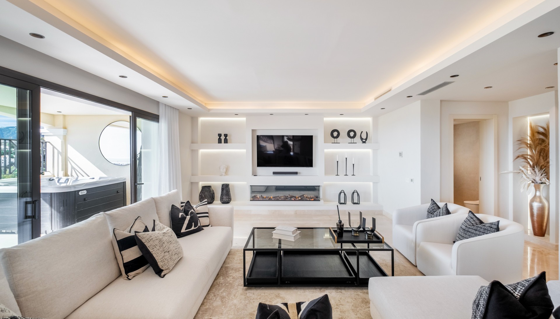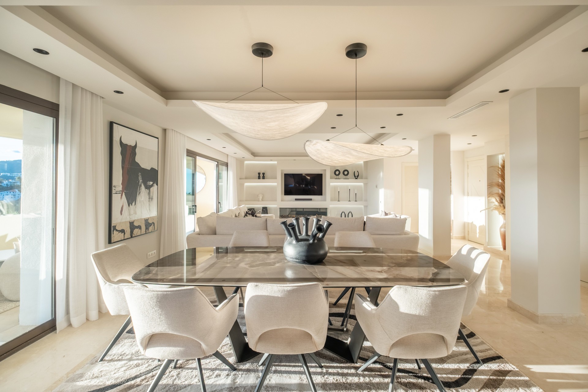 South west facing, duplex Penthouse with panoramic views of the sea, mountains, pine forest and Nueva Andalucia´s Golf Valley. Some other features are: +/- 45m2 living-room with a large, separate dining room, large master bedroom with high ceilings, all 3 bedrooms with ensuite bathrooms plus guest toilet, well equipped SieMatic kitchen, split system A/C and underfloor heating, alarm, feature fireplace, superb terraces, 3 garage spaces and large storage. The urbanisation offers a heated indoor swimming pool with a gym and his/her saunas and changing rooms with showers, 2 community pools, on site service office, 24 hr security and more. A truly special oasis only a few minutes drive to 4 championship level golf courses, Puerto Banus, international schools, the beach and all amenities. Welcome !!!