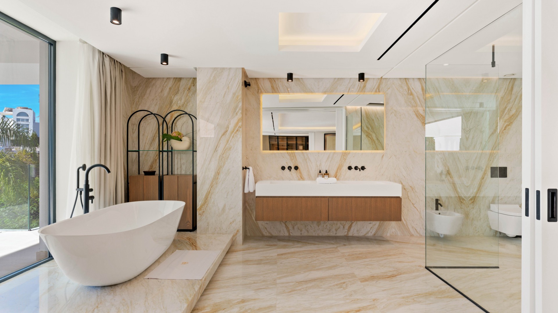 A state-of-the-art, south facing 7 bedroom villa with sea and golf views designed by a well renowned local architect using the finest materials and with great attention to detail. Set on an elevated plot walking distance to La Quinta Golf and a few minutes' drive from Puerto Banus plus easy access to the motorway. Due to its elevated position, the property enjoys open sea and golf views and utmost privacy. It´s south facing position means you can enjoy sun all day in its beautifully landscaped garden and 20 metre long pool. No effort has been spared in bringing together the finest materials, state-of-the-art technology and craftmanship to make this a very special property. Bright and open, the main level has a grand double-height entrance hall with large skylight which makes a dramatic statement together with the sea view across the room, a double staircase and a lift that provides easy access to the three levels of the property. The spacious living room is flanked on either side by open fireplaces that separate the tv room on one side and the dining room on the other. The modern chef's kitchen with a separate butler's kitchen opens to the dining area and a second lounge where you can have the family close by or pre-dinner drinks when entertaining. An office and a guest bedroom suite with independent access are also on this level. Upstairs the impressive master bedroom suite enjoys a privileged position with a private, open terrace and panoramic views. Four additional bedrooms suites, all of them with private terraces provide generous accommodation on this level. Perfect leisure time is guaranteed by all the amenities on the lower level of this villa with an amazing spa area incorporating a heated indoor pool, cold pool, sauna, hammam, massage room and a fully equipped gym. For additional entertainment, the wine cellar, cinema room and the games room with snooker and poker tables provide something to suit almost every taste including car-lovers who will be able to watch their toys parked in the 3 car garage. Outdoors a flat manicured garden is set around the 20 metre infinity styled pool with a large gazebo with sitting and dining areas, bar and kitchen. This is the perfect home for either a family to create great memories, to entertain friends and enjoy the privileged lifestyle that this property and Marbella offers.